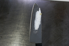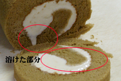 | ■失敗の原因 要するに上手に切るポイントは“包丁に生クリームが付かないこと”です。 よく熱湯で包丁を温めると良いと言われますが×。包丁をコンロの火に直接かけて熱を入れる方法は△。熱を加え過ぎるとロールケーキを切った断面の生クリームが暖かくなり溶ける場合があります。溶けると味が落ちますのでご注意。古い包丁は焼くと黒くなってしまう事もあります。 この方法でも切れない事はありません。ただ少し調整が必要です。 |