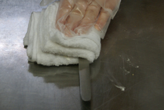 | ■失敗例 右の写真はごく普通にご家庭で使われている包丁(三徳)で当店のロールケーキを切った写真です。見ての通り毎日ロールケーキを切っている私達スタッフもなかなか上手に切れません。 高さのある包丁では切っている間に生クリームがたくさん包丁にくっついてしまいます。その生クリームが周りのスポンジを引きずって、切れば切る程ケーキが崩れていきます。 |
